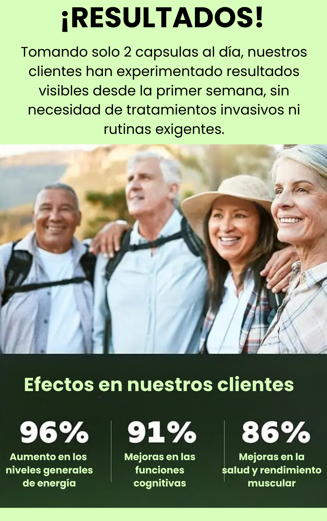 - Energía celular optimizada: Aumenta la energía sostenida al optimizar la función mitocondrial.